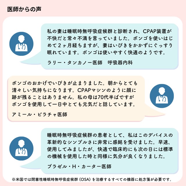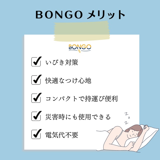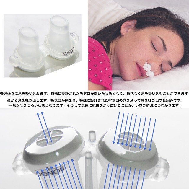 【睡眠時無呼吸症候群】の治療として開発されたBONGO(ボンゴ)! ボンゴはアメリカで生まれた手のひらサイズのいびき対策 鼻腔挿入デバイスです。 シリコン素材を鼻に挿入することで、睡眠時の気道を確保するという発想で開発されました。就寝前に鼻に挿すだけで鼻腔を広げ、いびきをケアします。やわらかいシリコン素材を使用しているので、着け心地は快適です。睡眠環境の質の向上につながります。 睡眠時無呼吸症候群の診断には、医療機関でのPSG検査が必要です。 睡眠時無呼吸症候群があると、夜間の不眠や日中の眠気以外に、コントロール不良の高血圧や糖尿病の元となり、こういった慢性的な交感神経の過剰興奮の状態は、10年後以降の脳梗塞、脳出血、心筋梗塞等のカラダの致命的な疾患の発症の原因となってきます。 睡眠時無呼吸症候群の治療は、ダイエット減量、口腔機能の体操(あいうべ体操)、口を閉じて寝る(口テープ)、横寝などですが、一定以上病状が悪くなるとこれでは間に合わなくなります。 そうすると、日本では医療機関に毎月受診して、 医療機関からCPAP(持続的陽圧呼吸療法)の機械をかりて毎夜装着する治療が必要となります。 CPAPは素晴らしい治療です。 ただ、CPAPが合わないといって離脱される方が5人に1人くらいお見えです。 その方々に、BONGOをお勧めしています! 使い方はとってカンタンです。 就寝時にボンゴを鼻につけて寝るだけです。少し息がはきづらいかもしれませんが、そこがポイントです。息を吐くときに抵抗をかけることで、気道が確保され、いびき対策を行います。 ◇こんな方におすすめです◇ ・CPAP(シーパップ)が保険適用されなかった方 ・CPAP(シーパップ)になじめなかった方 ・いびきでお悩みの方 ・出張やご旅行など ・あご周りに肉のついて、夜間にちょくちょく目が覚めるかた ・朝口の中が乾燥している方 ● アメリカ食品医療品局(FDA)から許可を受けた商品です。 ● ご使用にあたり電力・ホースが不要です。 ● ポケットに収まるコンパクトサイズで、どこでも手軽に持ち運べます。 内容:ボンゴ/1セット 【推奨使用期間】 1セットあたりのメーカー推奨使用期間は3ヶ月です。 (あくまで目安になります。使用後は毎日きれいにお掃除していただければ3か月以上持ちますが、商品に過度な変色、硬化や亀裂ができた場合には速やかに新しいボンゴと交換をしてください) 【ご注意事項】 ※対象者に次の症状がみられる場合、本品のご使用はお控えください。 ・高炭酸ガス血症性呼吸不全、呼吸筋力低下、水疱性肺疾患、バイパスされた上気道、気胸、縦隔気腫などを含む重度の呼吸障害 ・重症心疾患 ・低血圧 ・上気道(鼻、副鼻腔または中耳を含む)の炎症または感染症、または鼓膜の穿孔